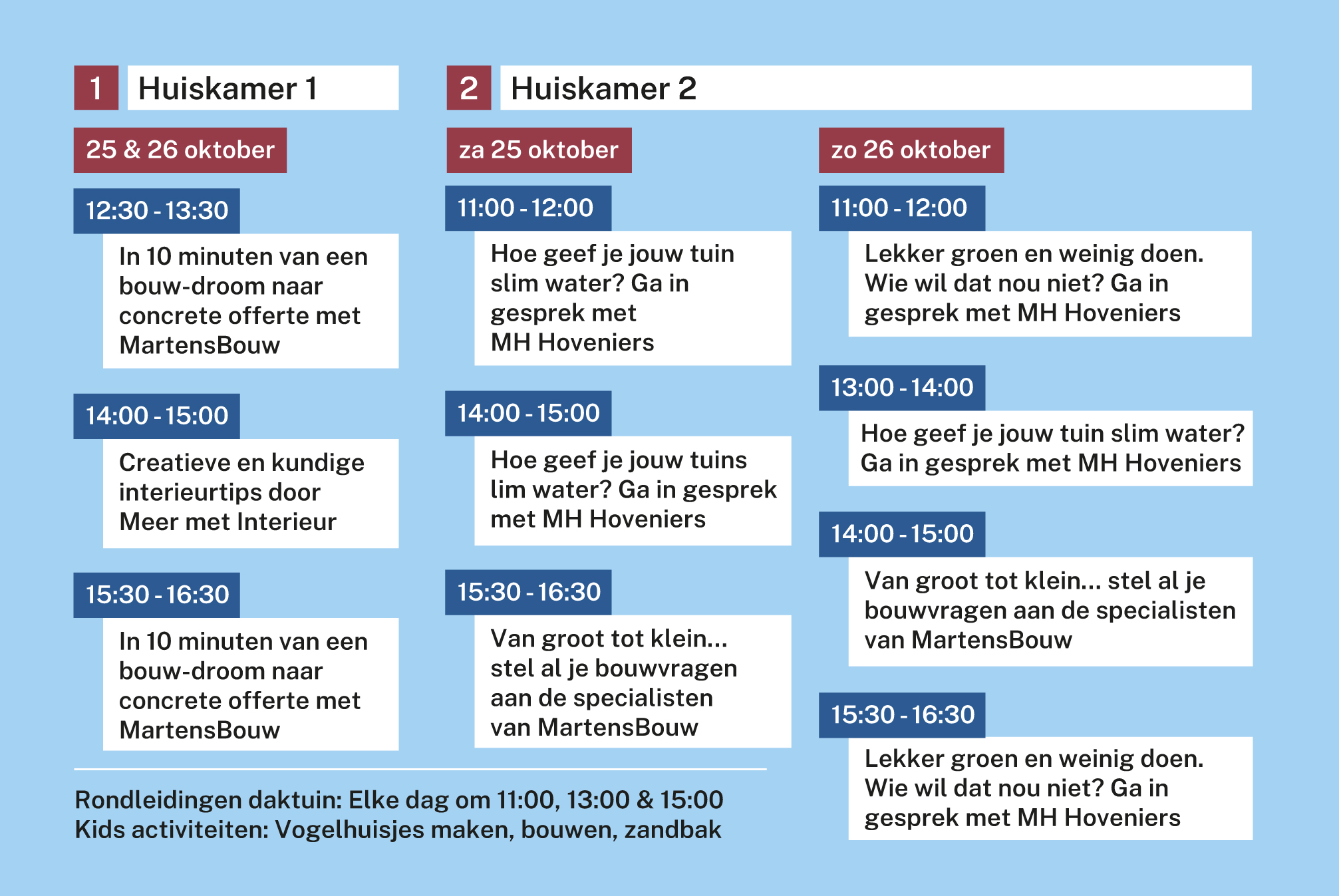 De inspirerende lezingen in de ‘huiskamers’ werden drukbezocht. Onderwerpen varieerden van het realiseren van bouwdromen en het creëren van een écht thuis tot het ontwerpen van een onderhoudsarme, groene tuin. Ook de excursie naar de daktuin bovenop het Inspyrium kon op veel enthousiasme rekenen. Aan de jongste bezoekers was eveneens gedacht; ze konden onder andere vogelhuisjes bouwen en spelen in de enorme zandbak.
